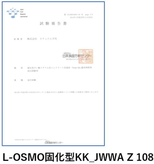 当社のけい酸塩系表面含浸材【L-OSMO】シリーズは、水道用資機材の浸出試験方法(JWWA Z 108)の基準を満たしております。(食品分析センターに試験を委託)