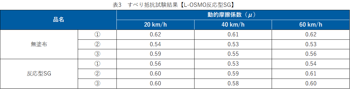 本試験に用いたコンクリート舗装を想定し作成したコンクリート版は、【L-OSMO】シリーズの無塗布・塗布それぞれで路面新設時のすべり摩擦係数の評価値(案)(参考資料 表4)を満足していました。