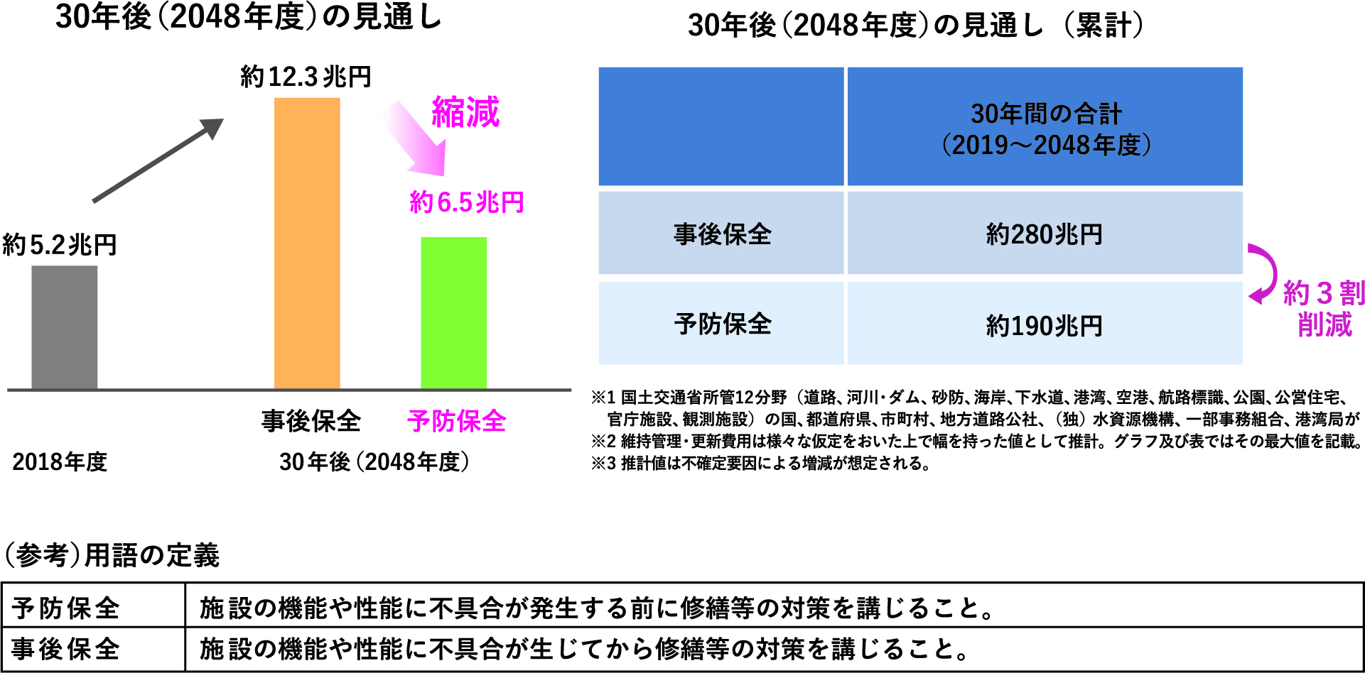 「予防保全」 と 「事後保全」 の維持管理・更新費用の比較